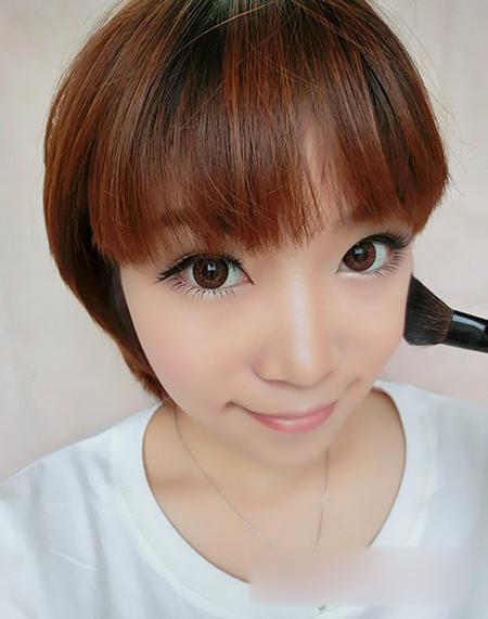 6.用眼影刷沾取带点咖啡粉色的眼影刷在眼尾处。
